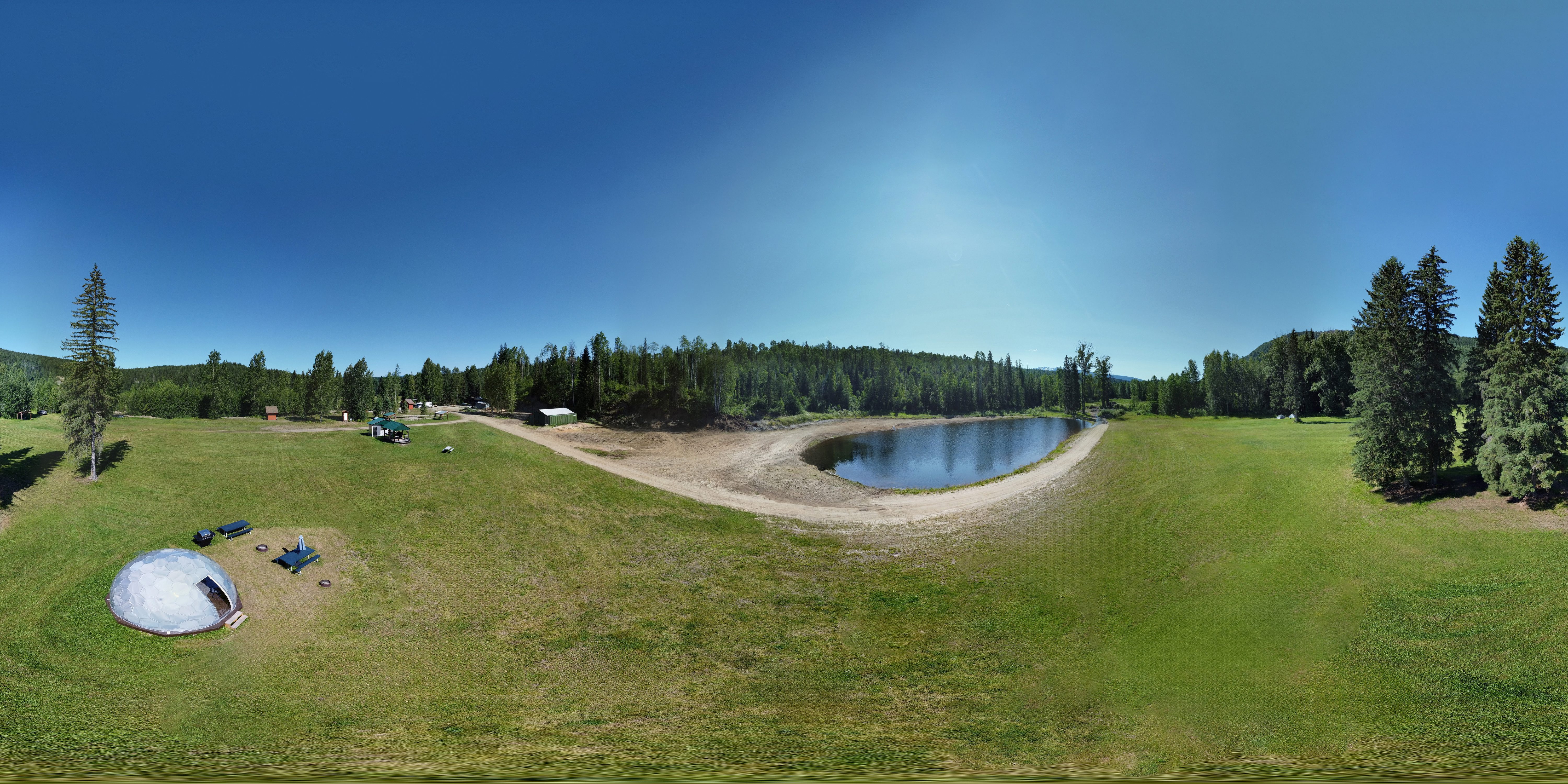 Drone view of the full 400-acre property. Click hotspots to explore.